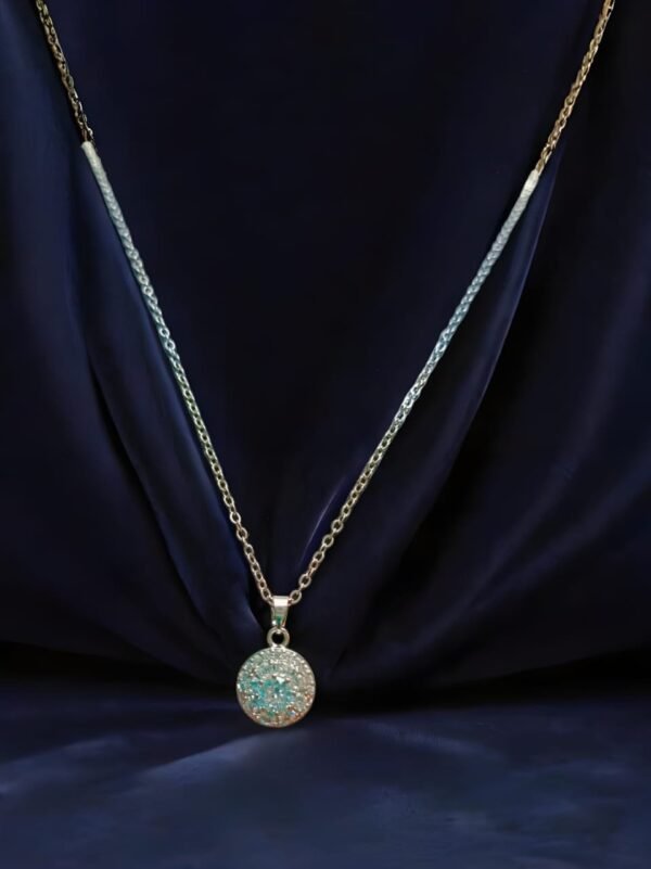 Read More DetailsIntroducing the Kanhaverse Aqua Radiance Crystal Pendant Necklace, a graceful piece designed to illuminate your style. This stunning necklace features a circular pendant adorned with sparkling aqua blue and clear crystals, symbolizing serenity and strength. Crafted with precision and finished in high-polish silver tone, it perfectly complements both casual and formal attire. Whether worn for an evening soirée or a special celebration, this necklace adds a refined touch of luxury to any ensemble.
