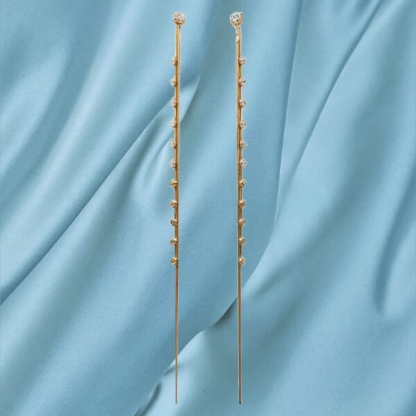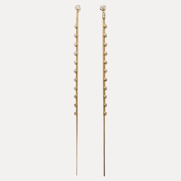 The Kanhaverse Celeste Crystal Linear Drop Earrings are a vision of understated elegance. Designed with sleek gold-toned bars adorned with delicately placed crystals, they create a graceful shimmer with every movement. The ultra-slim silhouette adds length and poise, making them a perfect match for both contemporary and evening wear. Ideal for parties, formal events, or chic everyday styling, these earrings offer a refined sparkle that never goes unnoticed.